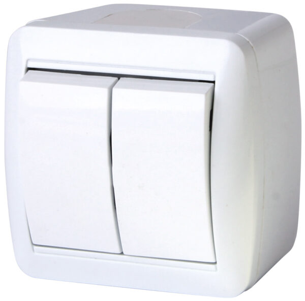 Двохклавішний вимикач E.Next e.aqua.1112.gr IP44 (s035052) з високим ступенем захисту від пилу і бризок води -IP44, застосовується для відкритого монтажу в приміщеннях зі складними умовами на промислових об’єктах, та в приватному секторі.